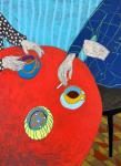 Этот оригинальный рисунок масляной пастелью передаёт сцену цветного интерьера, наполненного характером, теплом и художественным очарованием. Работа выполнена вручную с использованием смелых линий и насыщенных цветов и изображает тщательно продуманное пространство с пышными растениями, выразительным настенным искусством и эффектным синим шкафом, который становится композиционным центром.