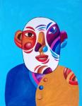 на охристом фоне необычный образ мужчины с ярко выраженными частями тела в разнообразных цветах