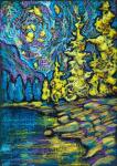 В процессе работы я сдвигаю восприятие вглубь, что позволяет наполнению образов картины живой энергией, что откликается при взаимодействии зрителя с картиной, и оказавшись втянутым в космический танец энергий вселенной, проникаем в свою сопричастность и единство с Природой земли и всего космоса.