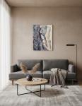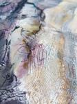 В этой работе фактура становится главным языком: марля, уголь и акрил взаимодействуют так, будто поверхность собирает в себе следы времени. Левая часть — плотная, насыщенная, правая — светлая, мягкая, почти растворяющаяся. Контраст материалов и тонов формирует динамику перехода, в которой зритель может прочитать собственные состояния и ассоциации.