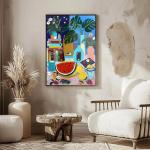 На фоне насыщенного синего цвета натюрморт излучает энергию, уют и жизнерадостность. Смелые формы, игривые узоры и яркая цветовая палитра делают его идеальным акцентом для кухни, столовой или гостиной.