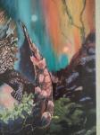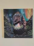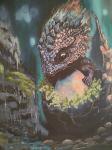 На картине изображен маленький дракончик, только что вылупившийся из яйца. Он маленький, симпатичный с яркими чешуйками и лучистыми глазами. Вокруг него раскинулся загадочный лес, с ветками могучих деревьев, сквозь которые лучи солнца проникают, освещая таинственный мир фантазии.