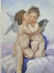 Купидон и Психея в детстве", копия картины одного из величайший художников 19 века Вильяма Бугро. Перед нами мелейшие нежнейшие ангелоподобные создания. Что интересно, на некотором расстоянии кажется, что Купидон смотрит на Психею, но приблизившись заметите, что его игривый взгляд устремлен прямо на вас, он всегда в поиске новой жертвы свои стрел. А Психея издалека кажется недовольной назойливыми приставаниями, но вблизи на её губах заметна лёгкая улыбка и на лице радость такому вниманию. Картина как бы показывает природу отношений мужчины и женщины : скромность, застенчивость встречается с горячей настойчивостью, напором. Нежные переходы теплых красноватых теней и лёгкие зеленоватые света кожи. Тёплые оттенки тел и нежнейшие сиреневые дали. Композиция, анатомия, цветовые сочетания Бугро потрясают своим совершенством. Он был настоящим мастером, профессионалом влюбенным в свое дело. Его живопись относят к романтическому реализму, однако в работах Бугро много символизма, скрытых смыслов. Творчество художника пользовалось огромной популярностью, картины продавались за баснословные суммы, у него было много учеников и последователей.