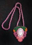 Колье сделано из бисера розового, золотистого и зеленого цвета. Кулон имеет форму грозди с листиком, в центре - натуральный камень индийский самоцвет