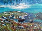 Горное озеро в Казахстане. Ясный холодный день. Снег.Яркая вода горного озера.