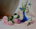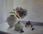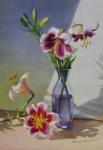 Желтые лилии в бутылке из черного стекла, освещенные солнцем, на зеленом фоне.
