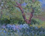 Полянка цветущих незабудок под кроной дерева.