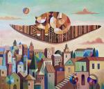 Удивительный рыжий кот видит во сне геометрические сны. Он летает на своем ковре-самолете над разными городами и странами. Картина будет хорошо смотреться в детской комнате, спальне, комнате для игр..