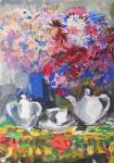 Картина относится к позднему периоду творчества художницы. В это время она все чаще и чаще пишет "для себя", без привычной оглядки на соцреалистический канон, на требования выставкомов. Пишет обычно натюрморты с фруктами, овощами, дагестанскими кувшинами, морскими раковинами, экзотическими масками, но чаще всего - цветы. Она упивается их природной красотой и словно наверстывает что-то упущенное за десятилетия работы на госзаказ…