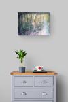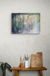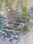Мерцающие отражения деревьев и неба на поверхности реки постоянно меняются, отражая непрерывное течение и обновление воды. Постоянная игра света и тени напоминает нам, что вся видимая жизнь подвержена постоянному движению и бесконечному циклу роста, включая человека, как неотъемлемую часть природного мира. Картина выполнена акрилом и масляной пастелью в мягкой, спокойной цветовой палитре.