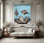 На этой картине асимметричные морские раковины, шахматная фигура, песочные часы и игральные кости собираются на шахматной доске, создавая уникальную трактовку времени, пространства и выбора.