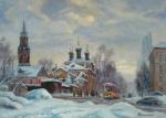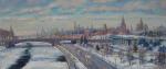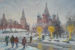 Сказочный зимний вид на собор Василия Блаженного и Кремль. Чудесна подсветка, особо её контраст с обильными сугробами. Постарался передать нежный зимний свет чуть пробивающегося солнца, его блики на засыпанном снегом соборе. Цельный жемчужный колорит нашей зимы.