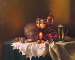 Натюрморт с самоваром с пасхальными куличами и яйцами к празднику Пасхи, выполненный маслом на холсте.