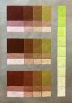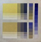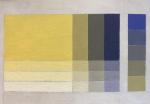 крупный прямоугольник чистой тюбичной краски, вниз от него по три ступени разбела; справа – по три ступени с подмешанным к жёлтой краске чистым синим диоксазином.