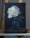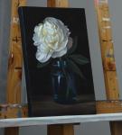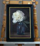 Картина с пионом написана масляными красками на холсте, натянутом на подрамник.
