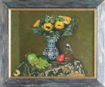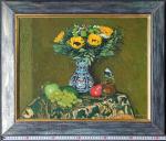Ключевые слова: колорит драпировка плоды изящный жизнь любование кисть мазок пульсирует декоративный гобелен ваза лепестки виноград яблоко энергия букет цветы подсолнухи