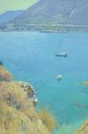 Это очаровательное произведение искусства изображает безмятежный прибрежный пейзаж около деревни Бали на острове Крит, в котором преобладают кристально чистые бирюзовые воды, которые легко притягивают взгляд зрителя. Одинокий парусник и небольшая шлюпка плавно плывут по воде, придавая композиции динамичный и в то же время спокойный вид. Изрезанная береговая линия, украшенная золотисто-коричневой растительностью, красиво контрастирует с яркой синевой моря, придавая картине глубину и фактуру. Величественные холмы возвышаются на заднем плане под затянутым дымкой безоблачным небом, создавая ощущение простора и спокойствия. Художник мастерски передает взаимодействие света и воды, создавая завораживающую игру цветов, отражений и фактур. Вертикальный формат картины подчеркивает природное величие сцены, делая ее одновременно интимной и экспансивной. Эта картина выделяется своими изысканными деталями и созданной им безмятежной, идиллической атмосферой, располагающей к бесконечному спокойному созерцанию и медитации.
