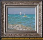 Этот натурный этюд написанный художником в Белеке в Турции представляет собой спокойный морской пейзаж с ярким изображением бирюзовых вод под ясным небом. На переднем плане запечатлено плавное движение волн, выполненное с помощью тщательной работы кистью, что придает изображению ощущение текучести и глубины. На заднем плане две парусные лодки с развевающимися парусами скользят по спокойному морю, добавляя динамичности этой умиротворяющей сцене. Мастерское использование цвета художником создает гармоничное сочетание океанской синевы и тонких оттенков неба, отражая мирную атмосферу прибрежного дня. Изящная серебряная рама подчеркивает элегантность картины, привлекая внимание к ее замысловатым деталям. Эта работа выделяется своей способностью вызывать освежающую, безмятежную атмосферу морского пейзажа, воплощая вневременную красоту моря.