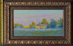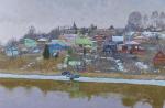 Этот натурный этюд написанный художником в деревне Карманово Тверской области в 2002 году — захватывающий дух пейзаж, излучающий спокойствие и мастерское использование цвета. Сцена запечатлела тихую сельскую местность с тонким, но поразительным контрастом между пышной холодной зеленью в тени и яркими желтыми полями и домиками на краю деревни освящаемыми солнцем . Далекое сооружение выглядывает из-за листвы, создавая фокусную точку, которая естественным образом притягивает взгляд зрителя к холсту. Небо, залитое мягкими пастельными тонами, напоминает нежные объятия заката, добавляя ощущение времени и атмосферы. Художник использует деликатную, но уверенную технику мазков, оживляя текстуры и слои природных элементов, подчеркивая движение и глубину. Эта работа уникальным образом сочетает простоту и сложность, приглашая зрителей исследовать безмятежную красоту сельской жизни. Каждый элемент расположен намеренно, способствуя общей гармонии и выразительности этого пленительного пейзажа.