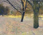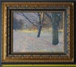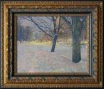 Этот натурный этюд художник написал зимней ночью на бульваре в январе недалеко от своего дома в районе Марьино за пару сеансов, что-то дописывал в мастерской. Эта работа запечатлела тихую зимнюю сцену, сосредоточив внимание на заснеженных деревьях под мягко светящимся небом. Композиция тщательно проработана: толстые ветви резко контрастируют с пастельным фоном, намекая на ночные огни города. Снег, изображенный тонкой пастозной техникой, покрывает землю, отражая тонкое взаимодействие света и тени. Художник мастерски использует приглушенную цветовую палитру, усиливая спокойствие и глубину сцены. Гармония теплых и холодных тонов подчеркивает естественную красоту и тишину зимнего пейзажа. Картина обрамлена богато украшенной золотой рамой, которая добавляет элемент классической элегантности, еще больше повышая ее эстетическую привлекательность. Картина не только изображает момент в природе, но и вызывает чувство спокойствия и созерцания, вовлекая зрителя в ее мирные объятия.