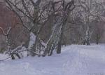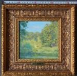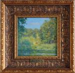 Этот натурный этюд художник написал в парке Царицыно у верхнего пруда в сентябре 2002 года. Эта картина, оформленная в изысканную раму, изображает тихий пейзаж, передающий суть природного спокойствия. Сцена представляет собой пышный, зеленый лес парка, залитый мягким светом ясного дня. На переднем плане расположен тихий пруд, отражающий зелень зеркальным блеском, что усиливает глубину композиции. Использование художником ярких зеленых и синих оттенков создает яркий контраст с солнечным светом, проникающим сквозь деревья, добавляя текстуру и объем. Детальная работа кистью оживляет листву, заставляя зрителя почти почувствовать шелест листьев и шепот легкого ветерка. Золотая рама с замысловатой резьбой дополняет естественную красоту картины, подчеркивая ее вневременную привлекательность и перенося зрителя в мирный, нетронутый мир. Эта работа является образцом совершенства в пейзажной живописи, запечатлевая мимолетный момент безмятежной красоты с мастерской точностью.