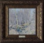 Этот натурный этюд художник написал в Москве у реки Сетунь, в апреле когда только сошёл снег, и лесники приводят в порядок парк, распиливая старые упавшие деревья. Эта работа — шедевр пейзажной живописи, с изысканной точностью запечатлевший безмятежную лесную сцену. Художник использует тонкую палитру мягких коричневых, серых и зеленых оттенков, чтобы передать спокойствие лесной поляны ранней весной. В центре картины находятся поваленные и распиленные деревья, петляющие по композиции и отражающие окружающий свет тонкими мазками. Окружающие деревья с их тонкими стволами и редкой листвой создают ритмичный узор, направляющий взгляд зрителя вглубь сцены. Игра света и тени тщательно проработана, добавляя глубины и объема. Картина, заключенная в богато украшенную позолоченную раму, которая дополняет ее деревенскую элегантность, является свидетельством тонкой наблюдательности художника и его мастерской техники, приглашая к созерцанию и восхищению тихой красотой природы.