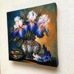 Картина маслом "Ирисы" выполнена в материалах: холст на подрамнике, масло. Размер холста 15х15см. Холст на подрамнике фабричного производства г. Санкт-Петербург. Оборотная сторона холста обработана оверлоком. Натяжка галерейная. Торцы прокрашены в подолжение изображения. Рама не обязательна.