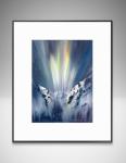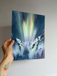 Эта оригинальная вертикальная акварель запечатлела интенсивное, парящее сияние северного сияния над крутым горным перевалом. Свет устремляется вверх яркими зелёными, жёлтыми и розовыми оттенками на фоне глубокого звёздного ночного неба. Заснеженные вершины изображены в динамичных, абстрактных тёмно-синих тонах. Это драматичное небесное искусство станет идеальным подарком для любителей ночного неба и незабываемым рождественским подарком для всех, кто ценит драматизм высокогорья.