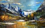 Это симфония природных контрастов, запечатлённая на холсте. Величественные заснеженные вершины, словно сверкающие драгоценности, отражаются в зеркальной глади озера. У подножия гор раскинулся золотой ковёр осенней листвы, добавляя теплоты и глубины композиции. Динамичные мазки и игра света создают ощущение прохлады горного воздуха и тишины заповедной природы. Этот пейзаж превратит любой интерьер в пространство вдохновения, напомнит о мощи и красоте мира.