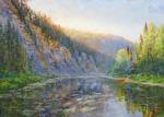 Река Ай на картине маслом. Достопримечательность Южного Урала - скалы Большие Притёсы. Летний пейзаж с рекой. Раннее утро. Уральские горы. Художник Екатеринбурга Екатерина Тютина-Зайкова