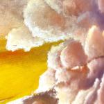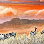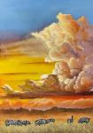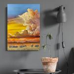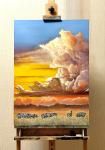 Картина передаёт момент закатного покоя африканской саванны, когда небо и земля сливаются в едином дыхании света и цвета. Массивные облака, наполненные тёплым сиянием, становятся главным эмоциональным акцентом композиции, создавая ощущение величия и тишины природы.