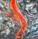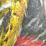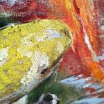 Картина «Течение кои» наполнена движением и живой энергией воды. Яркие, переливающиеся оттенки оранжевого, золотого, белого и алого создают ощущение глубины и непрерывного потока жизни. Каждый мазок написан вручную масляными красками, что придаёт работе особую фактуру, объём и живое присутствие.