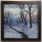 Берег небольшой речки, которая не замерзла до конца. Деревья и земля покрыты снегом. Задний план освещен утренним солнцем.