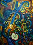 Яркий, почти витражный город собран из наклонённых домов и красных крыш, которые тесно прижимаются друг к другу, как в сказке. Сквозь плотную мозаику улиц проходит светлый поток — река или луч, разрезающий пространство и задающий движение всей композиции. Завитки и фактура усиливают ощущение ветра и живой энергии, а контраст бирюзы, золота и терракоты превращает пейзаж в праздничное, сновидческое видение.