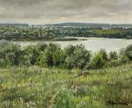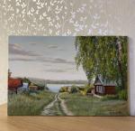 Картина летний пейзаж «Деревня на берегу реки» написана масляными красками на холсте, натянутом на подрамник.