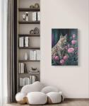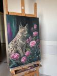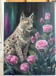 Эта авторская картина маслом изображает величественную рысь, окруженную нежными розовыми розами, создавая впечатляющий контраст между силой дикой природы и утончённой красотой цветов.