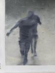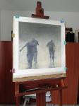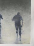 Три размытые человеческие фигуры в стремительном беге сквозь заполненное пылью и обломками пространство. Импрессионистская абстракция с акцентом на динамику движения и атмосферу тревоги.