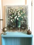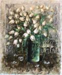 Летняя усадьба встречает своих хозяев после холодной зимы букетом белоснежных Тюльпанов-символом Весны…Бирюзовые вкрапления передают влагу воздуха после дождя,а первоцветы в вазе-присутствие человека,который наконец-то соединился с природой!