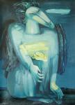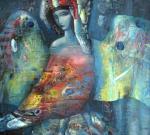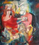 Мистическая картина, выполненная в манере экспрессионизма с элементами кубизма. Дама в красном держит карту, определяющую судьбу персонажей: женщина в белом, солдат в каске. Их окружают падающие люди. Животные и предметы: черная кошка; корова как символ материнского инстинкта; череп и маски как символы бренности бытия.