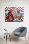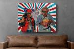 На картине представлены известные персонажи трилогии "Назад в будущее" — Марти Макфлай и Доктор Браун, расположенные в центре композиции и окруженные ярким абстрактным фоном, который символизирует динамику и энергию их приключений.