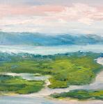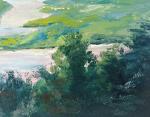 На картине изображен живописный закат над рекой Волгой, окруженной зеленью деревьев. Приглушенные оттенки предзакатного неба создают атмосферу уюта и спокойствия.