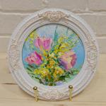 Картина с цветами весенний букет мимоза с тюльпанами - интересный подарок на 8 марта.