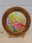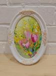 Картина с цветами тюльпаны с мимозой, написана маслом в стиле импрессионизма объемными мазками и оформлена в гипсовую, ажурную раму.