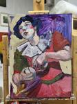 Работа «Поэзия» из серии работ «Цирк». Когда я работала над этой картиной, я увлеклась чтением биографии Сергея Есенина. Она чем-то похожа на его образ. Поэтому она приобрела такое название. Работу мне захотелось оставить именно в таком виде, слегка незаконченной.