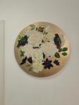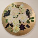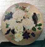Ключевые слова: изящная картина золотой фон картина поталь круглый холст натюрморт с цветами картина с птицами картина цветы и птицы розы масло белые розы картина розы