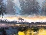На переднем плане картины, в озёрной глади, отражаются разноцветные всполохи восхода солнца, плавно  забирая зрителя в мир игры света и красок. Задний план представляет собой горные вершины потянутые утренним туманом, могучие и вечные. Ранняя заря начинает освещать этот мощный ландшафт и создает неповторимую атмосферу. Разноцветный туман стелиться по земле, пряча лесную живность. Наблюдая за этим процессом,  душа наполняется гармонией и спокойствием, пробуждаясь вместе с природой. Это удивительное зрелище никогда не утомляет и всегда останется в памяти, как символ очарования и величия матери- Земли.