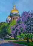 Картин написана с натуры. Утренний пейзаж в Санкт-Петербурге. Вид на Исаакиевский собор и на набережную реки Мойке с Поцелуева моста в тишине утреннего часа.