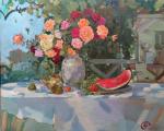 Ключевые слова: Розы, лето, солнце, натюрморт с цветами, арбуз