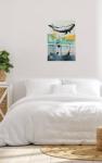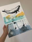 Это произведение искусства демонстрирует грациозную форму кита, скользящего по морю, его мощный хвост создает завораживающий всплеск. Умелое использование акварели автором создает динамичное взаимодействие света и тени, оживляя подводный мир. Путешествие кита запечатлено в движении, с нежными мазками кисти, которые вызывают чувство свободы и исследования. Это произведение не только празднует красоту морской жизни, но и приглашает зрителей задуматься о необъятности и тайне океана.