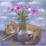 Ключевые слова: картина для спальни уют радость дачи светлая интерьерная живопись далекий домик пейзаж огромное небо с облаками спящий кот искусство атмосфера летнего блаженства полевые цветы в вазе рыжий кот дача картина сон летний день